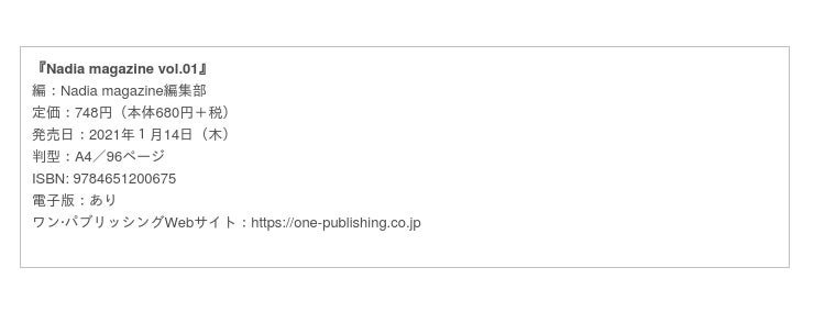 株式会社 ワン・パブリッシング(東京都台東区/代表取締役社長:廣瀬有二)は、2021年1月14日(木)に「Nadia magazine vol.01」(定価:本体680円+税)を発売いたします。