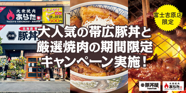 ワンズトライン株式会社(本社:大阪市北区芝田2丁目3番16号、代表取締役:山内仁)が運営する、北海道帯広の本場豚丼が人気の「元祖豚丼屋TONTON 富士吉原店」と、厳選されたお肉をボリュームいっぱいに味わえる「大衆焼肉あらた 富士吉原店」で、それぞれ期間限定キャンペーンを実施いたします。