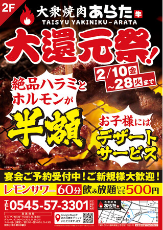 北海道・帯広豚丼が人気の「元祖豚丼屋TONTON 富士吉原店」(住所:静岡県富士市吉原1丁目2-12、TEL:0545-57-3301)では、2/28まで「豚丼【並】」を期間限定価格で提供、店舗2階「大衆焼肉あらた」でも2/10~28の期間中ハラミとホルモンを半額で提供いたします。