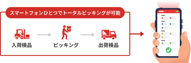 入荷検品(棚入れ)・ピッキング(棚出し)・出荷検品までのトータルピッキング(複数商品をまとめて取り出し、出荷オーダー別に仕分け)がスマホひとつで完了できます。また、返品や棚卸にも対応しています。