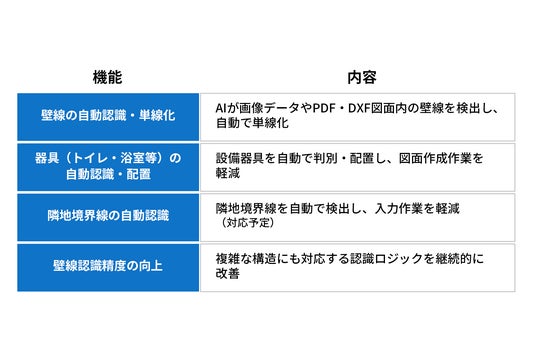本アップデートでは、画像データやPDF・DXF図面上の壁線や敷地の認識による単線化、器具の自動認識・配置を可能にし、従来30分程度かかっていた作業を数分で完了できるようになるなど、図面作成業務の大幅な効率化を実現します。
