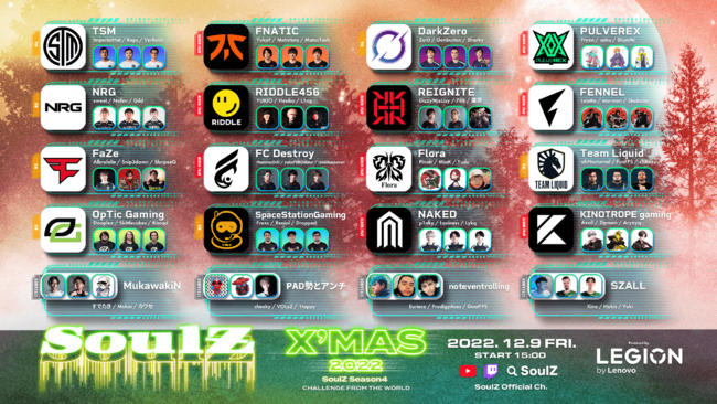 気になる出場チームは、SoulZ公式Twitter(@SoulZ_jp)にて発表され、今回はNA地区(ノースアメリカ)を中心とした世界トップクラスの海外プロチームが参戦!