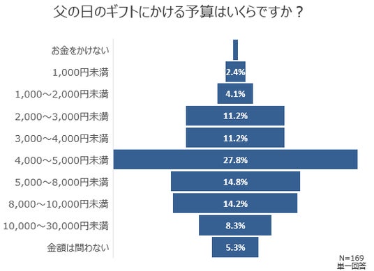 2.「父の日をたまに忘れる」、「たびたび忘れる」と回答した169人(31%)にギフトにかける予算を聞いたところ、予算はしっかり確保されていることが分かりました。最も多かった回答は、「4,000円~5,000円」(27.8%)、次は「5,000~8,000円」(14.8%)、「8,000~10,000円」(14.2%)と続きました。忘れられがちな父の日ですが、お父様への感謝の気持ちが予算にも表れているのでしょうか。