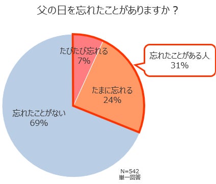 1.父の日を忘れたことがありますか?の質問に対して、31%の人が忘れたことがあると回答しました。忘れてしまった理由の多くは、「父の日がいつかわかりづらい」、「父の日のキャンペーンを目にする機会が少ない」でした。また、父親からのリアクションが少ない、友人や家族間の話題に出ない・・・とちょっと寂しいコメントもありました。