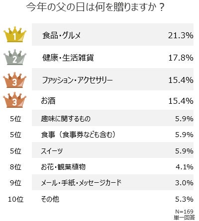 3.しっかりと予算が組まれていることが上記の結果から分かりましたが、実際に何を贈られているのか、集計してみました。1位は「食品・グルメ」、2位は「健康・生活雑貨」、3位は同率で「ファッション・アクセサリー」と「お酒」という結果でした。全対象者(542人)の回答結果と比較すると、上位4位までは全く同じでした。よって、「父の日を忘れたことがない」と回答した人と「父の日を忘れたことがある人」で贈り物自体に変わりがないことが分かりました。