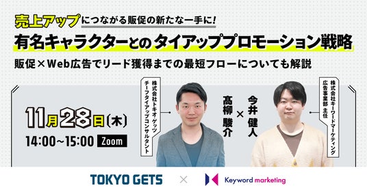 株式会社ベクトル(本社:東京都港区、代表取締役会長兼社長:西江 肇司、東証プライム:6058)の子会社である株式会社キーワードマーケティング(本社:東京都港区、代表取締役会長:滝井 秀典、以下 キーワードマーケティング)は、株式会社トキオ・ゲッツ(本社:東京都新宿区、代表取締役:小笠原 亨)と共同で、無料オンラインセミナー『売上アップにつながる販促の新たな一手に! 有名キャラクターとのタイアッププロモーション戦略 販促×Web広告でリード獲得までの最短フローについても解説』を11月28日(木)14時より開催いたします。