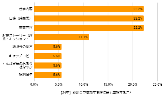 企業説明会へ参加する際に最も重視することをヒアリングしたところ、「オンライン開催であること」が最多だった23卒に対し(選考で求めるものも「WEB面談OK」が上位)、24卒は一貫して「仕事内容」と「事業内容」が約44.4%と上位に来ている。