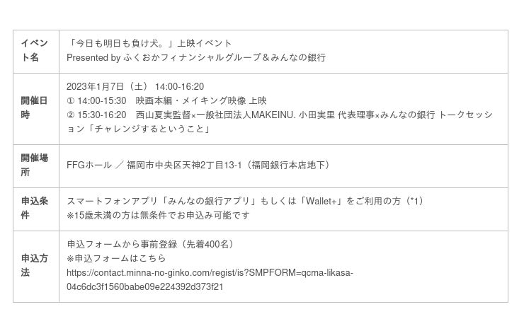 株式会社みんなの銀行(取締役頭取 永吉 健一、以下「みんなの銀行」)は、親会社である株式会社ふくおかフィナンシャルグループ(取締役社長 五島 久、以下「FFG」)と共同で、起立性調節障害を題材としたノンフィクション映画「今日も明日も負け犬。」(https://makeinu.dog/kyoumoashitamomakeinu/)の上映イベントを開催します。また、起立性調節障害に苦しむ方々や様々な壁を乗り越えてチャレンジする活動を応援したい気持ちを”つなぐ”「みんなのCheer Box」の提供を通じて、一般社団法人MAKEINU.(代表理事 小田 実里)の活動を支援します。