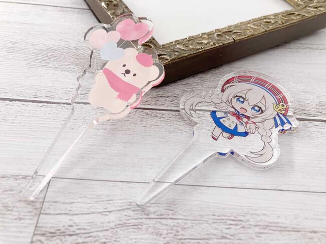 アクリルならではのクリアな質感と、自由なデザイン性が魅力。SNSでのシェアなど写真映えすること間違いなしのアイテムです。同人グッズやお店、企業のノベルティグッズや記念品など多様なシーンで効果を発揮するアクリルピックです。
