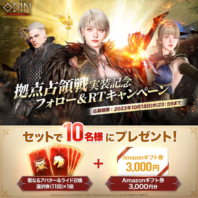 2023年10月5日(木)メンテナンス後よりアップデートされた拠点占領戦の実装を記念し、豪華プレゼントが当たるフォロー&RTキャンペーンを開催します!『オーディン:ヴァルハラ・ライジング』公式X(旧Twitter)をフォローした状態で、10月5日(木)に投稿されるキャンペーンポストをリポストされた方の中から、抽選で10名様にAmazonギフト券 3,000円分+聖なるアバター&ライド召喚選択権(11回)』をセットでプレゼント!