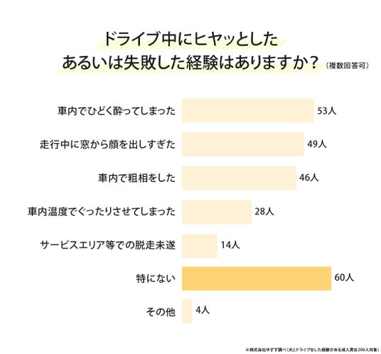 一方で、「車内でひどく酔ってしまった」53人(26.50%)、「走行中に窓から顔を出しすぎた」49人(24.50%)、「車内で粗相をした」46人(23.00%)も一定数みられました。