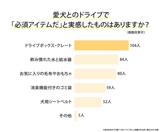 「愛犬とのドライブで『必須アイテムだ』と実感したものはありますか?」と尋ねたところ、最多は「ドライブボックス・クレート」104人(52.00%)でした。