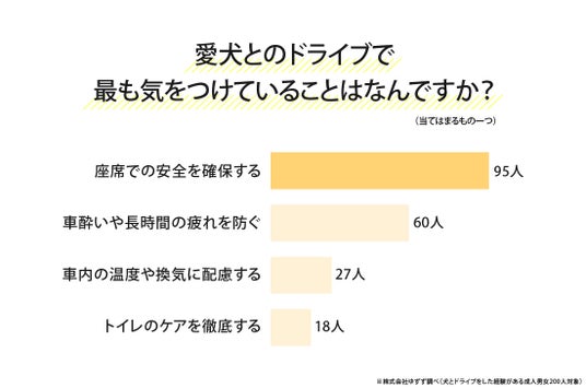 「愛犬とのドライブで最も気をつけていることはなんですか?」と尋ねたところ、最多は「座席での安全を確保する」95人(47.50%)でした。