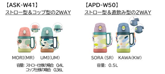 ピーコック魔法瓶工業株式会社(本社:大阪市、社長:山中千佳、以下ピーコック魔法瓶工業/ピーコック)は、このたびステンレス製真空二重構造を採用した新シリーズ 「ステンレスボトル 2WAYタイプ」 の2機種、「ASK-W41」 と 「APD-W50」 を発売いたしました。本シリーズは飲み方をお子さまの成長などに合わせて使い分けできる“2WAY”機能を備え、通園・通学をはじめ幅広いシーンでの利便性と快適さを追求したキッズ向けボトルです。
