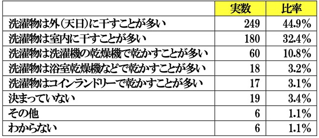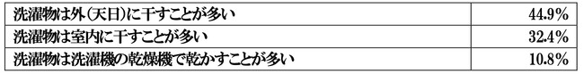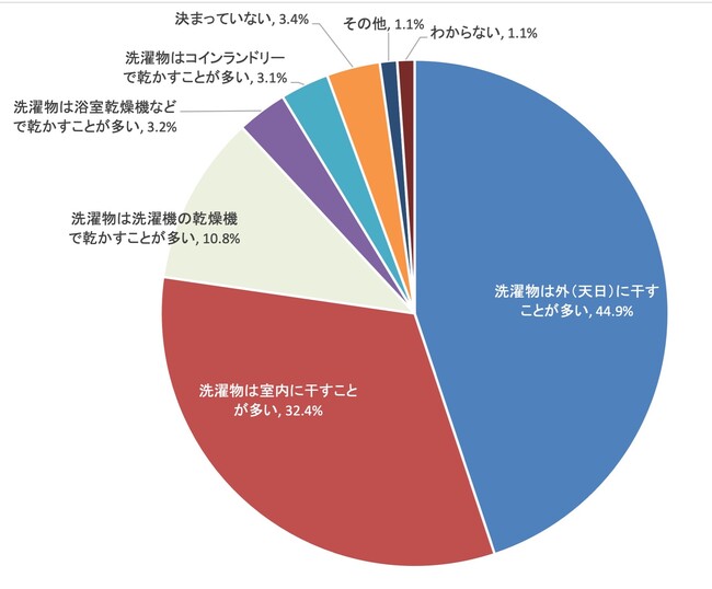 ・洗濯物をどこに干す(乾かす)ことが多いかと質問したところ、天日干し(44.9%)がトップとなり、続いて室内干しが32.4%、洗濯機の乾燥機が10.8%となり、天日干しが室内干しに対して12.5ポイント高くなっています。
