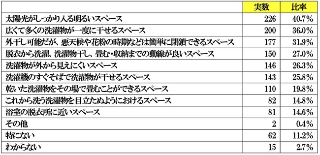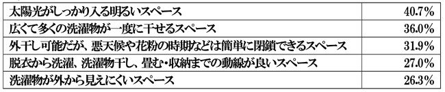 今回の調査において、欲しいランドリースペースとして、「太陽光がしっかり入る明るいスペース」(40.7%)、「外干し可能だが、悪天候や花粉の時期などは簡単に閉鎖できるスペース」(31.9%)が上位となりました。