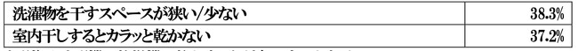 ・ご自宅に欲しいランドリースペースとしては、「太陽光がしっかり入る明るいスペース」(40.7%)、「広くて多くの洗濯物が一度に干せるスペース」(36.0%)、「外干し可能だが、悪天候や花粉の時期などは簡単に閉鎖できるスペース」(31.9%)となり、「太陽光がしっかり入り、天候によって天日干し&室内干しが可能な広いスペース」を求めていることが判明しました。