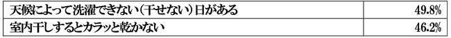 ・洗濯物干しの悩みは、天日干しが多い方では「天候によって洗濯できない(干せない)日がある」(49.8%)がトップ。室内干しが多い方の悩みのトップは、「洗濯物を干すスペースが狭い/少ない」(38.3%)。