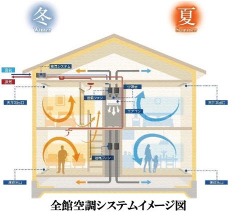 GLホームのオリジナルの「全館空調システム」は、東京大学名誉 教授 坂本雄三先生が発案し推進している、エアコン1台で家全体を空調する方法を基本とし、GLホーム独自のノウハウを加えて開発しました。2 階に設置したエアコンの暖冷房を大風量のファンで 1、2 階の吹き出し口に送り出す仕組みになっています。