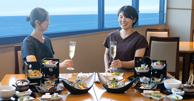 熱海の豊かな大自然に囲まれ、相模灘を一望する広大なベイエリアに建つHOTEL ACAOは、都心からわずか1時間でアクセスでき、館内どこにいても海を間近に感じるリゾートホテルです。今年7月に販売を開始した「なでしこプラン」は、女性同士の日帰り旅行を中心に好評を博し、約200名様にご利用いただきました。これをグレードアップさせ、より贅沢な食体験を提供するのが「なでしこプランプレミアム」です。近海で採れた新鮮な金目鯛、あしたか牛、天城山葵など、静岡を代表する食材や、伊勢海老やあわびなど贅沢な食材をふんだんに用いた「あかお御膳」には、金目鯛の煮つけ、駿河湾産の桜海老のかき揚げが、旬のラインナップとして加わりました。全8品とボリューム満点のランチは、日本料理 舞扇(まいせん)にてお楽しみください。