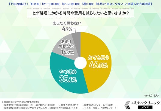 「ヒゲ処理にかかる時間や費用を減らしたいと思いますか?」と質問したところ、『とても思う(46.0%)』と回答した方が最も多く、次いで『やや思う(35.1%)』『あまり思わない(14.2%)』『まったく思わない(4.7%)』と続きました。