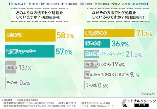 「どのような方法でヒゲ処理をしていますか?」と質問したところ、『カミソリ(58.2%)』と回答した方が最も多く、『電気シェーバー(57.0%)』と続きました。