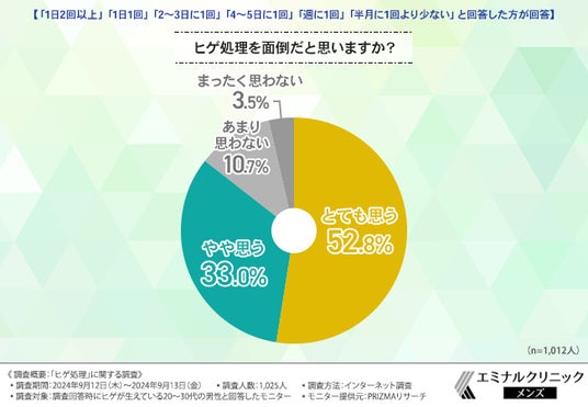 さらに、「ヒゲ処理を面倒だと思いますか?」と質問したところ、『とても思う(52.8%)』と回答した方が最も多く、次いで『やや思う(33.0%)』『あまり思わない(10.7%)』『まったく思わない(3.6%)』という回答結果になりました。