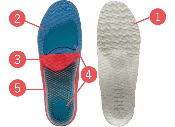 履き心地と歩き心地の向上のために、インソール自体に5つの工夫を凝らしています。