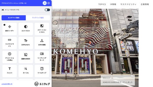 アイコンをクリックすると、アクセシビリティメニューが表示され、文字を読み上げてくれる部分リーダーや画面のコントラスト切り替えなどがボタン1つで可能です。