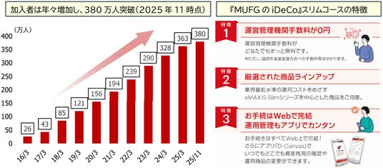 株式会社三菱UFJフィナンシャル・グループ(代表取締役社長 亀澤 宏規(かめざわ ひろのり)、以下 MUFG)は、連結子会社である株式会社三菱UFJ銀行(取締役頭取執行役員 半沢 淳一(はんざわ じゅんいち)、以下 三菱UFJ銀行)にて、個人型確定拠出年金(愛称:iDeCo)における、『MUFGのiDeCo』の新コース「スリムコース」を2026年3月5日にリリースします。
