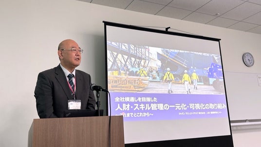 続いて、「Skillnote」利用企業講演として、ジャパン マリンユナイテッド株式会社 人財・組織開発センター 主査 鈴木方人様にご登壇いただきました。同社は、100年以上の歴史を持つ4つの会社の造船部門を再編し、2013年に誕生した造船会社で、現在、複数の事業所で「Skillnote」を利用しています。現場で働く作業者のスキル管理の一元化・可視化に取り組まれており、今回、複数拠点におけるスキル管理の工夫や苦労について発表いただきました。