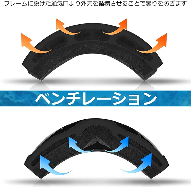 【曇り止め】スキーゴーグルのフレーム部分に設けた通気口から外気を取り入れることで、ゴーグル内部の暖められた空気を循環させて、レンズの曇を徹底的に遮断出来ました。