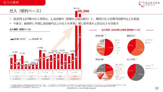 2025年12月期累計の仕入(契約ベース)は1,420億円(前期比+821億円)となりました。