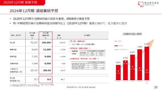 2026年12月期業績については、売上高1,000億円(前期比+236.7億円)、営業利益120億円(同+33.9億円)、経常利益90億円(同+18.0億円)、当期純利益80億円(同+6.3億円)を計画しております。増収増益の計画であり、6期連続の増益を目指してまいります。
