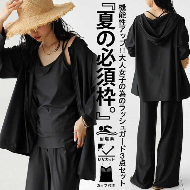 キャミソール、パーカー、パンツの3点がセットになった大人気ラッシュガードセット。UVカット機能はそのままに、耐塩素機能をプラスした改良バージョンが登場しました。プールの消毒剤に使われている塩素に対応し、劣化しにくく工夫しました。グーンと伸びる抜群の伸縮性があるのに、見た目はふつうの洋服のようなお洒落さ。夏のアクティブシーンに欠かせない、デザイン性と機能性を兼ね揃えた優秀アイテムです。