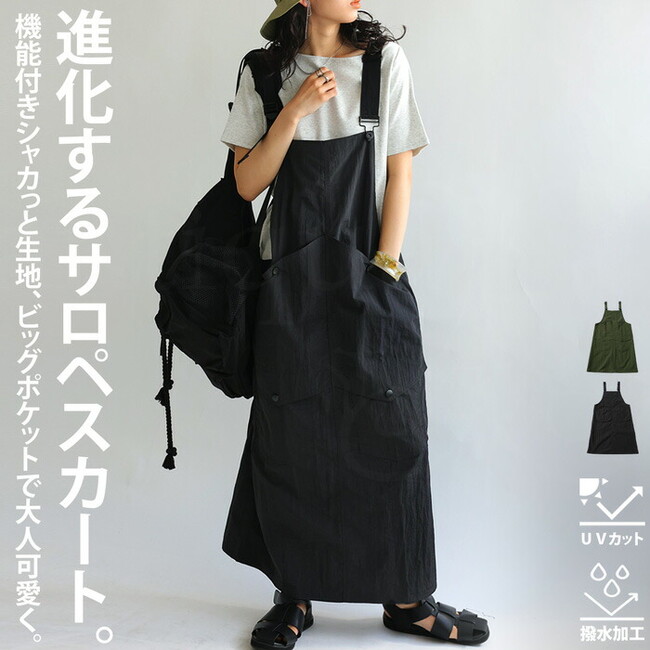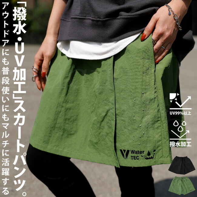 撥水とUVカット99%以上の加工がなされた機能性抜群のアイテム。ランニングやウォーキングのトレーニングウェアとして、フェスやキャンプなどのアウトドア、さらに普段の装いにも。人気のシャカっとした素材は今っぽく、取り入れるだけでお洒落に。スカートに見えて中はパンツになっているから動きやすく使いやすいのも嬉しいポイント。女性らしさもあるシルエットが大人可愛い印象。ベーシックなブラックカラーとカジュアルなカーキの2色展開で日差しが気になる季節に大活躍間違いなし。