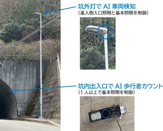 本システムは、脱炭素社会の実現に向けた取組みとして、高効率なLED照明の交換・導入に加えて、電力消費量をより一層削減するため、トンネルを通行する車両及び歩行者の存在を画像処理で検知し、通行時は所要の路面輝度を確保し、未通行時は減光運用を図るものです。