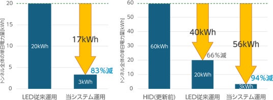 今回導入したシステムにおける単日のトンネル照明器具の電力比較(※1)において、LED従来運用の17kWhから3kWhと83%の削減を実現しました。
