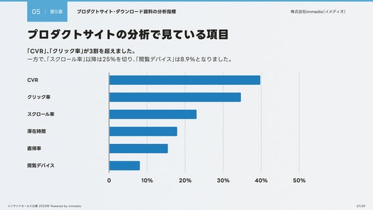 - コンテンツの分析ではウェブサイトでは「CVR」、「クリック率」が35%以上の企業で分析されているが、ダウンロード資料ではいずれの指標も25%以下に留まる。
