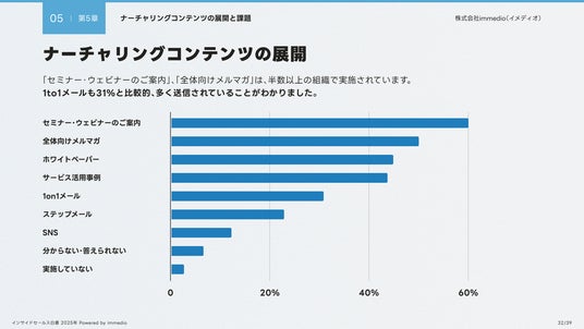 - ナーチャリングコンテンツでは、「セミナー・ウェビナーのご案内」「全体向けメルマガ」 「ホワイトペーパ」「サービス活用事例」が多く、45%以上の企業で実施されている。
