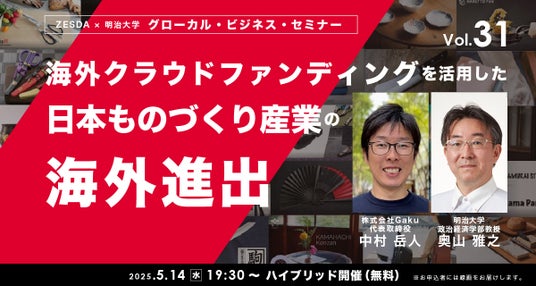 特定非営利活動法人ZESDA(代表理事:桜庭大輔、所在地:東京都中央区、以下NPO法人ZESDA)は、2025年5月14日(水)にグローカル・ビジネス・セミナーvol.31をハイブリッド開催します。今回は、株式会社Gaku 代表取締役の中村岳人(なかむら たけひと)さんをお迎えし、「海外クラウドファンディングを活用した日本ものづくり産業の海外進出」というテーマでお話しいただきます。