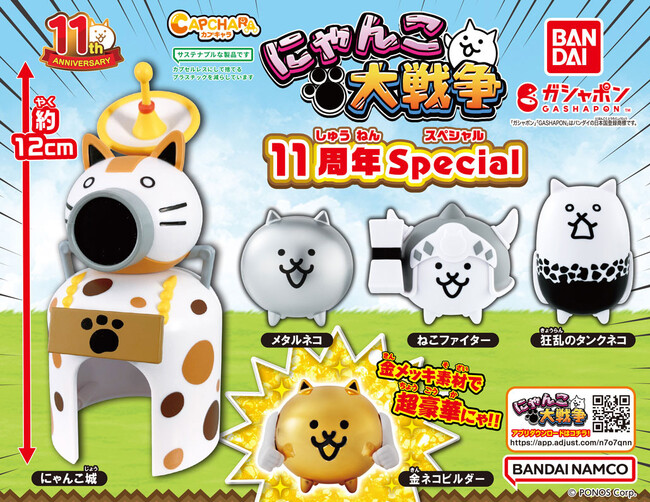 株式会社バンダイ ベンダー事業部は、ポノス株式会社(本社:京都府京都市、代表取締役:辻子依旦)のスマートフォン向けゲームアプリ「にゃんこ大戦争」のキャラクターをカプセルトイにした「カプキャラ にゃんこ大戦争11周年Special」(1回400円・税10%込、全5種)を2023年11月第3週から順次、全国のガシャポンバンダイオフィシャルショップ、玩具売場、量販店、家電店などに設置されたカプセルトイ自販機にて発売いたします。