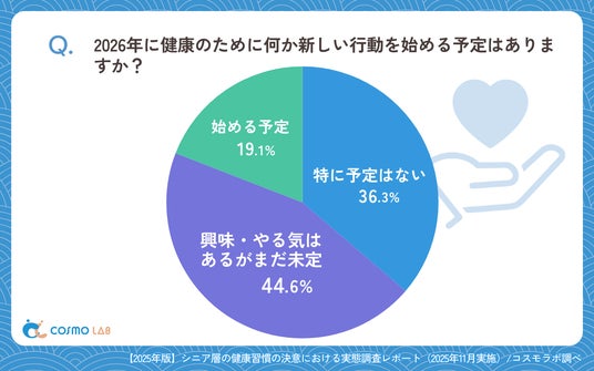 2026年に健康のために新しい行動を始める予定があるかを尋ねたところ、最も多かったのは「興味・やる気はあるがまだ未定」(44.6%)でした。続いて「特に予定はない」(36.3%)、「始める予定」(19.1%)という結果となっています。
