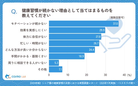 健康習慣が続かない理由としては、「モチベーションが続かない」(37.0%)、「効果を実感しにくい」(29.9%)が上位に挙がりました。