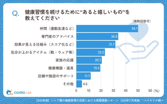 健康習慣を続けるために「あると嬉しいもの」として最も多く挙がったのは、「仲間(運動友達など)」で、50.1%と半数を超えました。