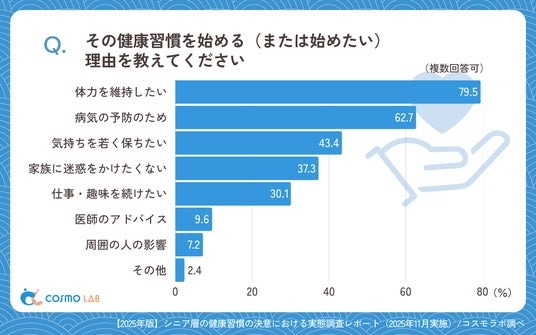 健康習慣を始める(または始めたい)理由としては、「体力を維持したい」が79.5%と最も多く、「病気の予防のため」(62.7%)が続きました。