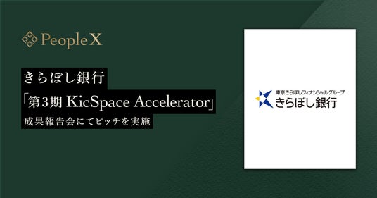 エンプロイーサクセス事業を推進する株式会社PeopleX(本社:東京都新宿区、 代表取締役CEO:橘 大地、以下:当社)は、株式会社きらぼし銀行(本社:東京都港区、頭取:渡邊壽信)をはじめとするきらぼしグループが実施する、将来性のあるスタートアップ企業との【新しい価値創造】を目的とした、アクセラレータープログラム「第3期 KicSpace Accelerator(キックスペース アクセラレーター)」に採択され、この度成果報告ピッチを実施いたしました。
