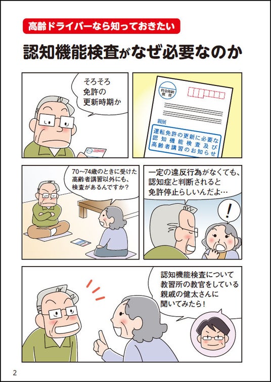 「なぜ認知機能検査がひつようなのか」「どんな検査を、何分くらいやるの?」といった基本的な疑問から、合格後の手続きまでを分かりやすいマンガで解説しています 。