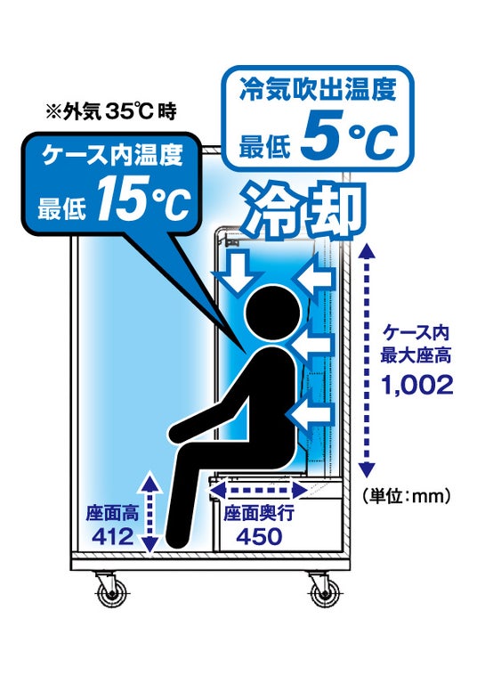 最低5℃の冷風と15℃のケース内温度により、体にこもった熱を短時間で効果的にクールダウン。熱中症予防の一時休憩所として最適です。