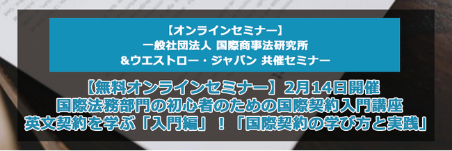 ウエストロー・ジャパン株式会社(東京都港区、代表取締役社長 ヨンソン・バン)は、2023年2月14日(火)、一般社団法人 国際商事法研究所と共催で『国際法務部門の初心者のための国際契約入門講座 英文契約を学ぶ「入門編」!「国際契約の学び方と実践」』と題したオンラインセミナーを開催いたします。